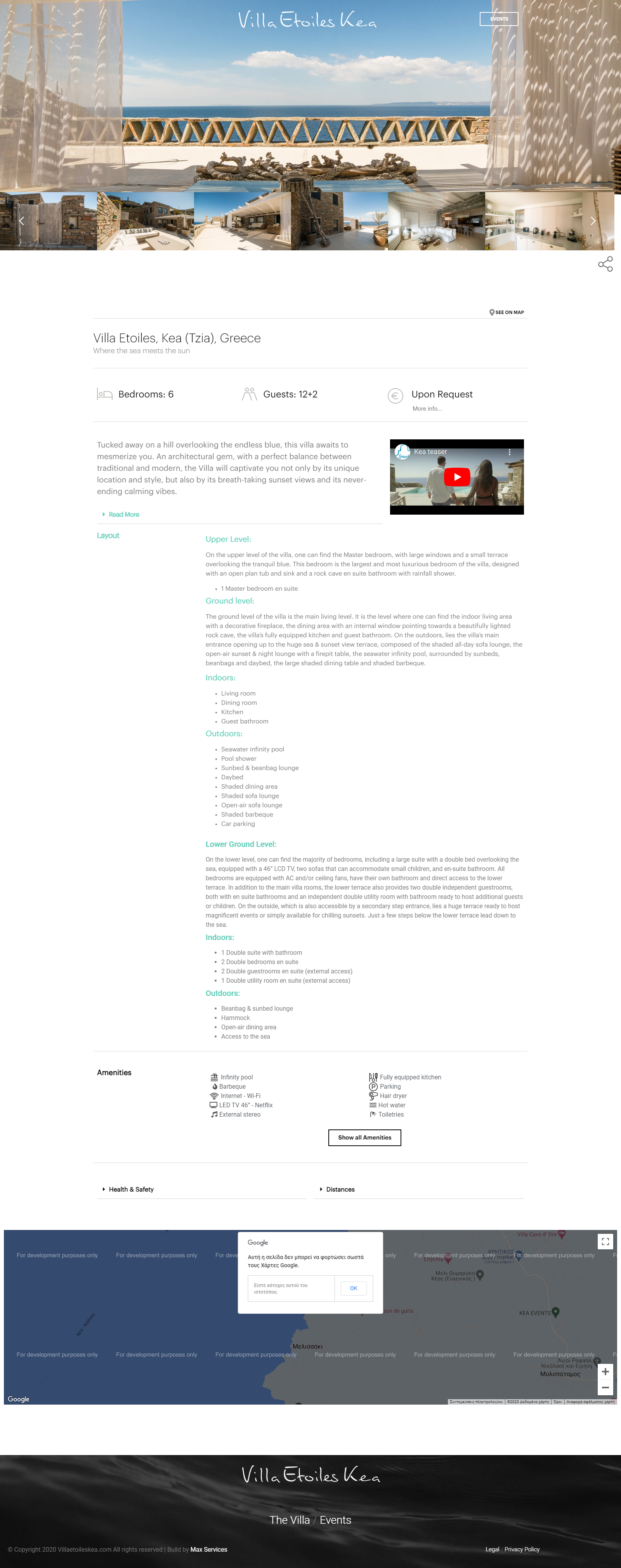 Elegant real estate website showcasing a luxury single villa on Kea Island, featuring property details, amenities, and booking information for an exclusive getaway experience.